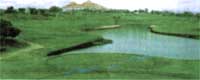 | Conventionality takes a back seat on this interesting par 5, which is split into two by a lake in the middle. From the first landing area, golfers can take either on e of two routes - play along the right, which is longer but takes the lake out of play, or go left, which is shorter but requires two good shots over water to reach the clover-shaped green. |